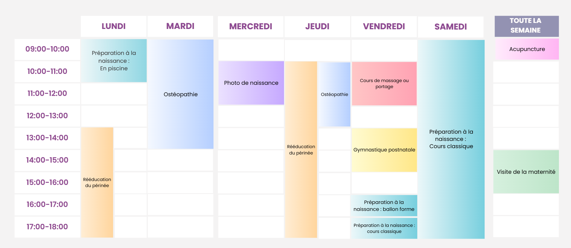 To support expectant parents throughout their pregnancy, the Maternity Ward offers a wide range of classes and services tailored to each stage: childbirth preparation, osteopathy and acupuncture sessions, breastfeeding consultations, and hypnosis for pregnancy and childbirth — as well as many other personalized support options.